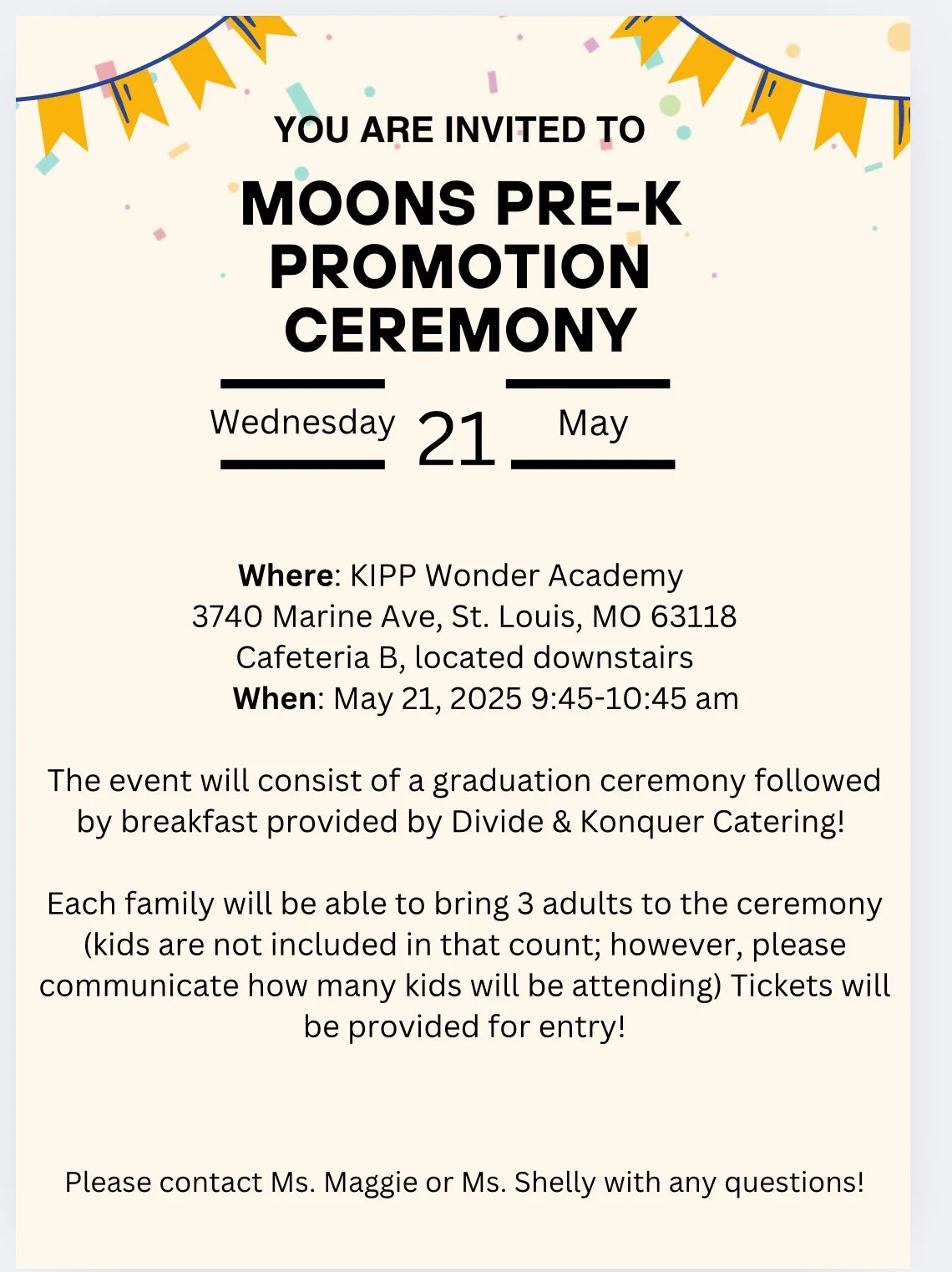 May 21 Moons Pre-K Ceremony Wednesday, May 21, 2025 9:45 AM 10:45 AM Kipp Wonder- Pre-K Southside (map) Google Calendar ICS Drop Catered Breakfast Service with Fruit Display. View Event →